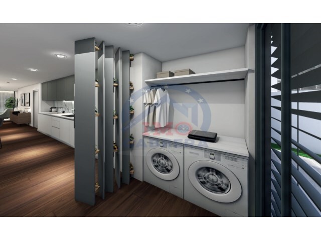 As cozinhas serão lacadas em branco alto brilho, com tampos em Silestone, totalmente equipada com equipamentos Bosch, lavandaria, roupeiros amplos lacados a branco.