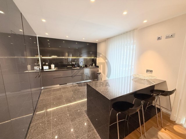 O apartamento com ar condicionado, aspiração central e sistema de som. A cozinha equipada com os eletrodomésticos: placa, exaustor, forno, micro-ondas, máquina de lavar loiça e frigorifico Side By Side Encastrar