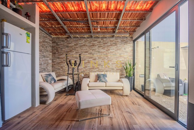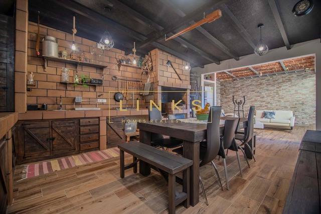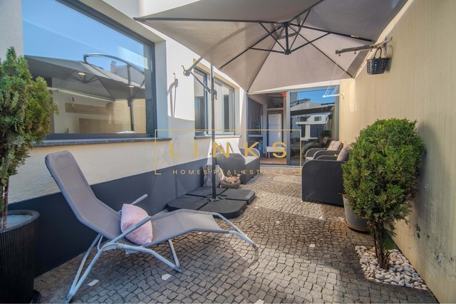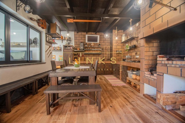 O grande diferencial desta propriedade é a sua generosa área exterior privativa. Inclui uma zona de barbecue coberta de estilo rústico, equipada com forno a lenha tradicional e paredes em tijolo burro, criando o ambiente ideal para convívios em qualquer época do ano. O pátio em calçada portuguesa reforça a identidade regional e oferece um espaço seguro e versátil ao ar livre.