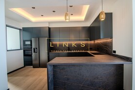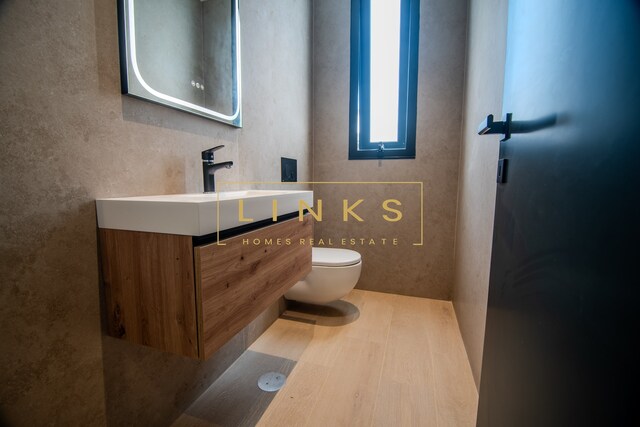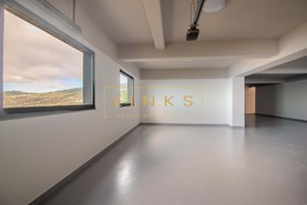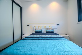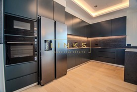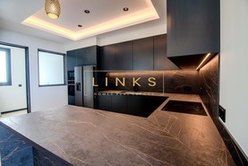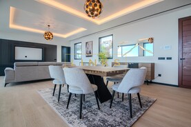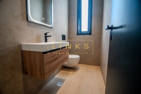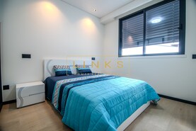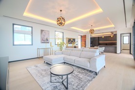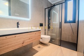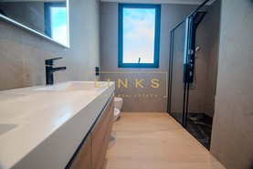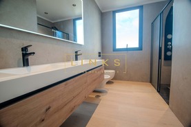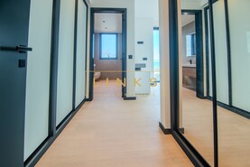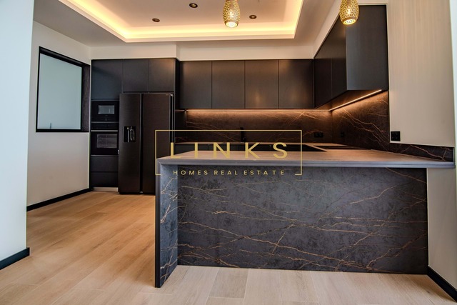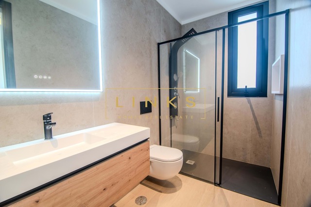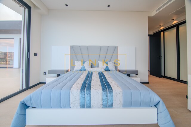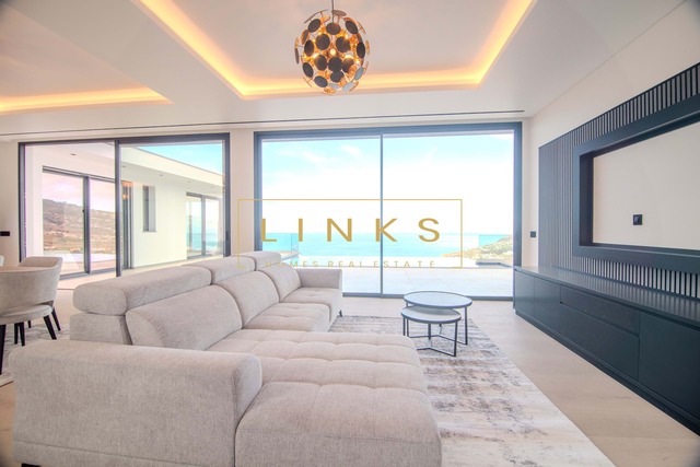 The main floor boasts a spacious open-plan living space, where the living room, dining area, and fully equipped kitchen merge into a modern and welcoming environment. Large glass windows open onto a generous terrace, perfect for leisure time, al fresco dining, or simply enjoying the golden sunset that paints the horizon every day.