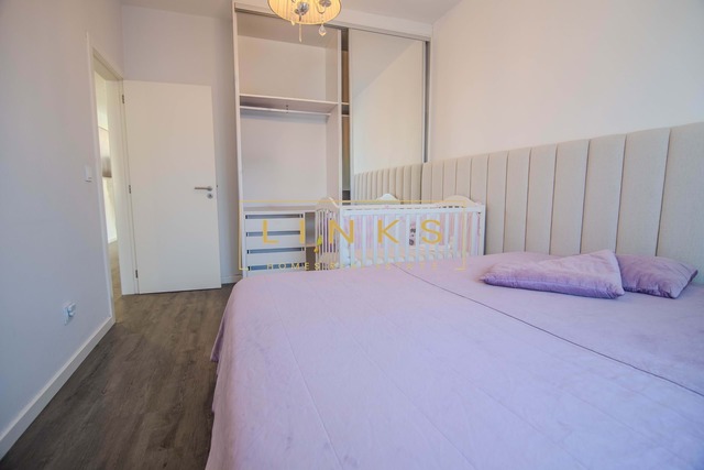 The social area features an open-plan concept, integrating a spacious living room with a minimalist modern kitchen and a functional island. High-quality wood-toned flooring runs throughout the home, providing a sense of continuity and thermal comfort.