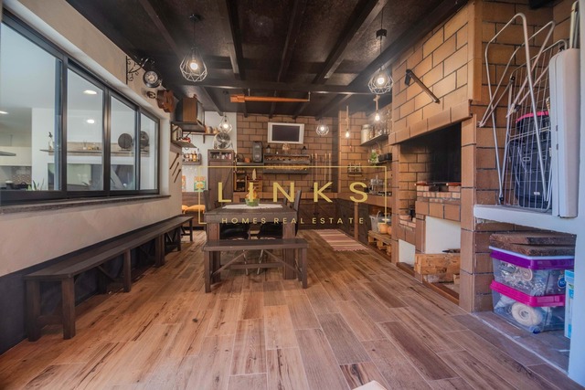The standout feature of this property is its generous private outdoor area. It includes a covered rustic-style barbecue zone, equipped with a traditional wood-fired oven and exposed brick walls, creating the ideal atmosphere for gatherings in any season. The patio, finished in traditional Portuguese pavement (calçada), reinforces the regional identity and offers a safe, versatile open-air space.