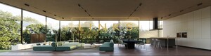 Os tetos altos permeiam os espaços gerando amplitude, enquanto as paredes panorâmicas de vidro do tipo cortina dissolvem a fronteira entre interior e exterior, enquadrando vistas ininterruptas da paisagem ao redor. A casa é construída com vidro espelhado duplo de alto padrão, com 70% de proteção UV garantindo conforto, privacidade e eficiência energética sem comprometer a transparência.
